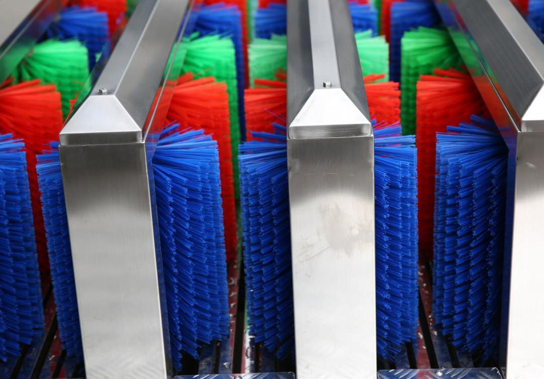 2、 電機(jī)驅(qū)動清洗臺上的 5 組刷子,高壓噴淋清水。