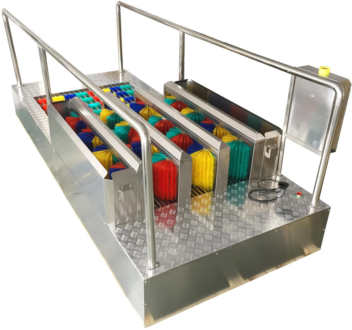 3、 使用人員行走在清洗臺上,利用刷子轉(zhuǎn)動刷洗鞋底達(dá)到清潔效果。